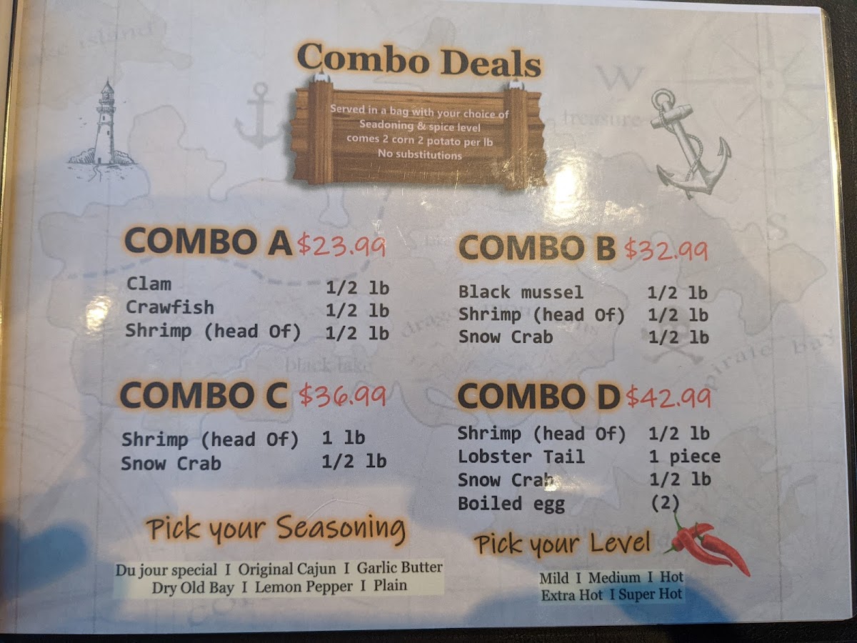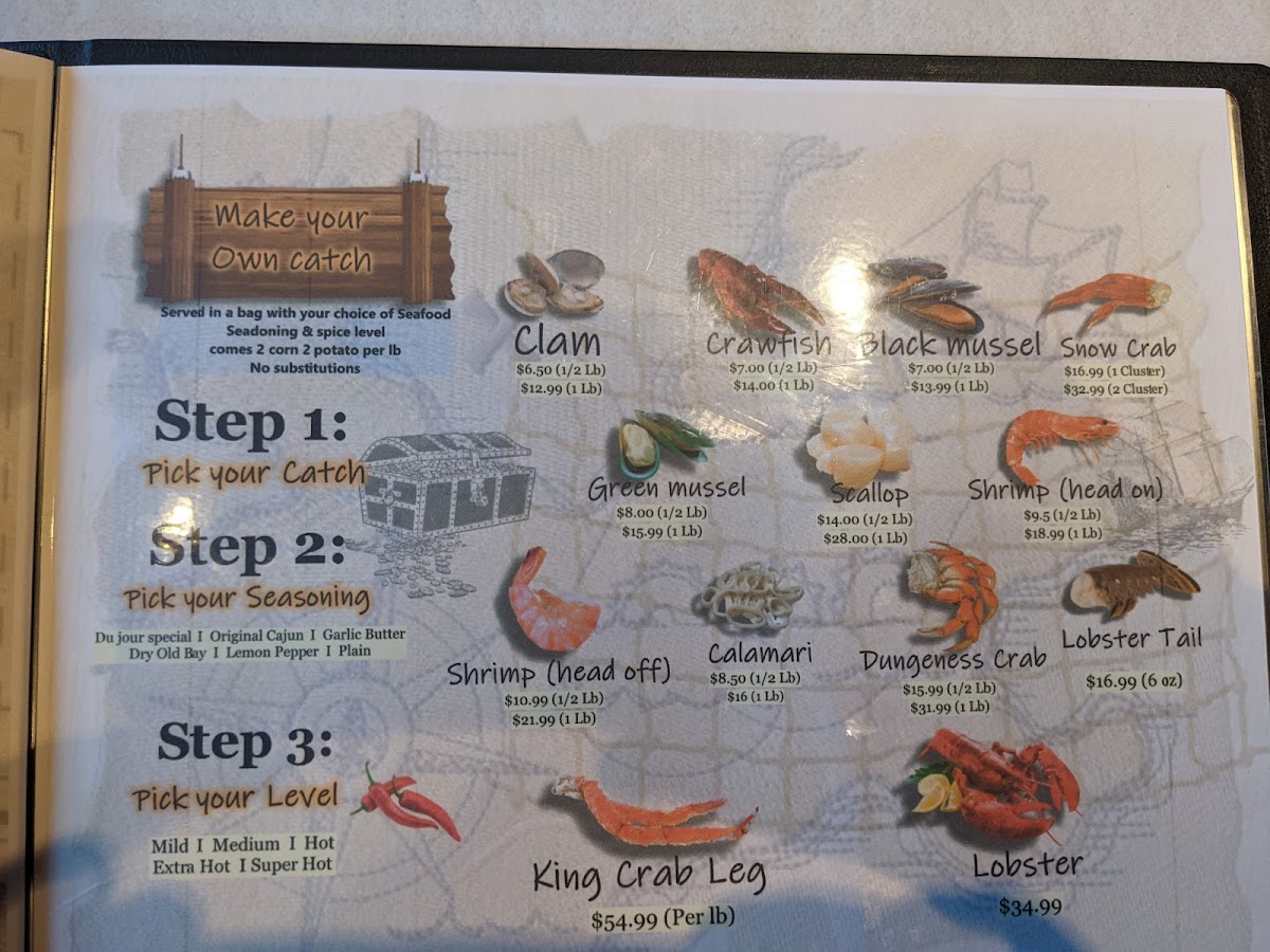 Served in a fda approved bag. choose 1 or more seafood seasoning and spice level. all comes with 2 corns and 2 potatoes.